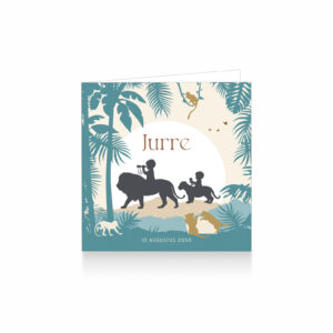 1018-Lief jungle silhouet geboortekaartje voor een tweede kindje, een jongen. Op dit kaartje zie je grote broer met verrekijker op een leeuw en zijn kleine broertje op een welpje in de jungle tussen prachtige tropische planten, aapjes en leeuwtjes.