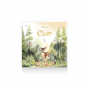 2273-Trendy waterverf bosdieren geboortekaartje voor een meisje. Op dit schattige kaartje zie je een handgeschilderd hertje, egeltje, uiltje en konijn in een bos.