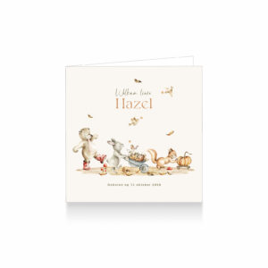 2266-Aquarel bosdieren herfst geboortekaartje voor een meisje of jongen. Op dit leuke kaartje zie je een handgeschilderd tafereel in waterverf van een beertje, konijntje met een kruiwagen vol met pompoenen en herfstblaadjes, een eekhoorn met pompoen en vogeltjes tussen blaadjes en paddenstoelen.