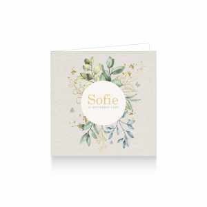 1501-Botanisch waterverf geboortekaartje voor een meisje met een wit rond label met takjes met blaadjes en goudlook spetters op kraft karton