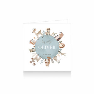 1500-Trendy unisex waterverf geboortekaartje voor een meisje of jongen met geschilderde bosdieren zoals een wasbeer, vogel, beer, egel, konijn, vos, otter, eland, uil, eekhoorn en hert op een grijs blauw aquarel rond label wereldbol met takjes en bloemen.