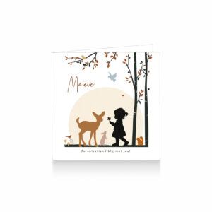 1498-Lief herfst silhouet geboortekaartje voor een meisje. Op dit leuke kaartje zie je een klein meisje een klavertje vier geven aan een hertje in een prachtig herfst bos tussen eekhoorn, konijntje en vogeltje.