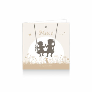 1496-Hip silhouet geboortekaartje voor een tweede kindje, een meisje. Op dit schattige kaartje delen grote zus en kleine zusje een schommel in een landschap met prachtige veldbloemen en konijntje op de voorgrond. Het kaartje is in beige tinten.