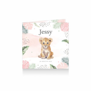 1553-lief waterverf geboortekaartje voor een meisje met een geschilderd leeuwtje tussen tropische bladeren en sterretjes
