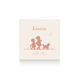 1542-Super leuk silhouet geboortekaartje voor een tweede kindje, een meisje. Op dit kaartje zie je grote zus hand in hand wandelen met haar kleine zusje en hun hondje. Grote zus wijst naar vlinders. Dit leuke kaartje is in terra tonen op een zand kleurige achtergrond.