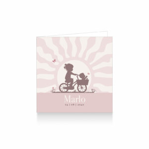 1548-Lief silhouet geboortekaartje voor een tweede kindje, een meisje. Op dit leuke kaartje zie je grote zus op een bakfiets samen met haar kleine zusje die naar een vlinder wijst. Op de achtergrond zie je een mooie zon.