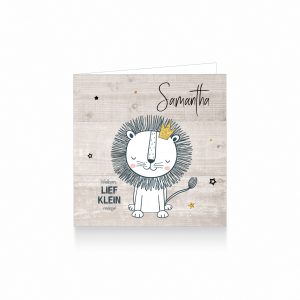 1528-Lief illustratief geboortekaartje voor een meisje met een getekend leeuwtje met kroon met goud glitters op een steigerhout achtergrond