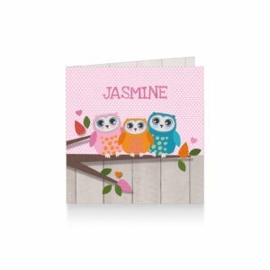 1539-schattig geboortekaartje voor een meisje van familie uil op tak met gekleurde blaadjes en hartjes op hout en stippen patroon