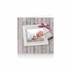 853-hip geboortekaartje voor een meisje van een fotolijstje met foto van je baby een kraftlabel met strikje op steigerhout