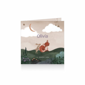 855-Een betoverd en mystiek sprookjesbos dieren geboortekaartje voor een meisje met geschilderde bosdieren zoals een vos en konijntje tussen prachtige planten, bloemen en met wolken, maan en sterren op de achtergrond.