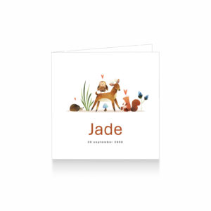 860-Super leuk waterverf dieren geboortekaartje voor een meisje met handgeschilderde bosdieren zoals een egeltje, hertje, uiltje en eekhoorn tussen takjes, bloemen en paddenstoel op een witte achtergrond.
