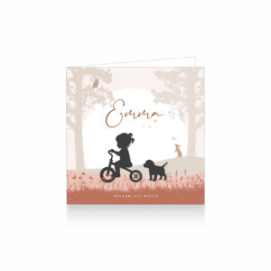 870-Schattig silhouet geboortekaartje voor een meisje. Op dit leuke kaartje zie je een meisje op een driewieler met haar puppy hondje in een prachtig bos met veldbloemen, konijn, hertje en vlinders. Het kaartje is in roest en taupe tinten.