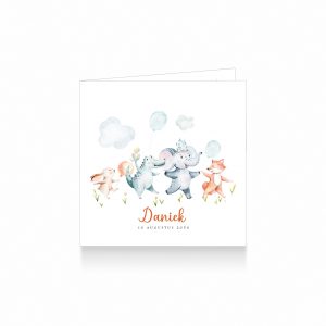 851-Waterverf dieren geboortekaartje voor een meisje met geschilderde dieren zoals een konijn met ballon, krokodil, olifant en vos