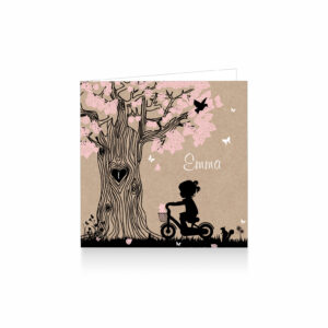 915-Hip silhouet geboortekaartje voor een meisje van een silhouet meisje op de fiets onder een boom met roze blaadjes en vlinders op kraft karton