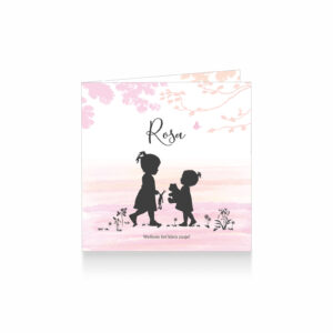 1288-Super lief silhouet geboortekaartje voor een tweede kindje, een meisje. Op dit leuke kaartje zie je grote zus en kleine zus met hun knuffels, hand in hand onder een prachtige boom met bloemen. Hun lieve puppy kijkt toe.