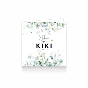 1297-Hip botanisch waterverf geboortekaartje voor een meisje met geschilderde Eucalyptus en olijf bladeren en goud confetti