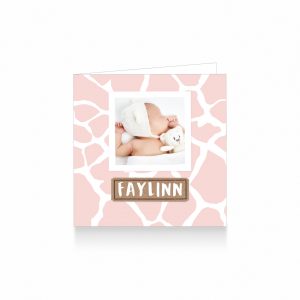 1286-Hip geboortekaartje voor een meisje met foto en kraft karton label op een giraf patroon in roze