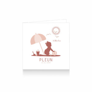 1298-Schattig zomer silhouet geboortekaartje voor een meisje. Op dit lieve kaartje zie je een baby meisje spelen op het strand met een strandbal onder een parasol. Het kaartje is in mooie roestrood tint en zalmroze.