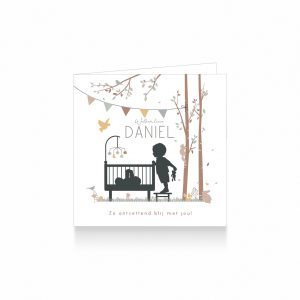 088-Lief silhouet geboortekaartje voor een tweede kindje, een jongen. Op dit kaartje zie je een baby jongetje in een ledikantje met mobiel. Grote broer kijkt over het randje van het ledikantje naar zijn lieve broertje in een bos met vrolijke slinger.