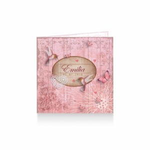 094-sprookjes geboortekaartje voor een meisje met papieren naamlabel, vogeltjes en vlinders