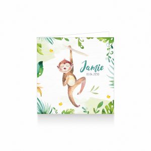 084-Handgetekend waterverf dieren geboortekaartje voor een jongen met tropische planten, exotische palmbladeren en aapje hangend tak, op groen aquarel