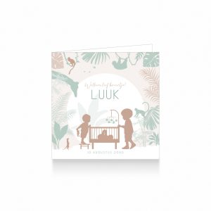 095-Hip jungle silhouet geboortekaartje voor een derde kindje, een jongen. Op dit kaartje zie je een baby jongetje in een ledikantje met mobiel, zijn grote en kleine broer kijken over het randje van het ledikantje naar hun lieve baby broertje in de jungle tussen tropische bladeren en dieren zoals, aapjes, giraf, leeuwen jong, luiaard en stokstaartje in mintgroen en taupe.