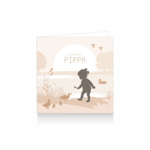 083-Trendy silhouet geboortekaartje voor een meisje. Op dit leuke kaartje wil een meisje een klavertjevier geven aan een eendje langs de waterkant in een Hollands landschap met water, eendjes en bomen. Het kaartje is in mooie zachte beige tinten.