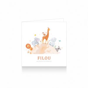 093-Super leuk waterverf geboortekaartje voor een meisje met geschilderde dieren zoals een leeuw, nijlpaard, giraf, aapje, olifant en koala op een wereldbol