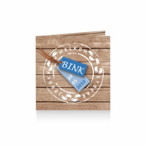 086-schattig jongenskaartje met vogeltjes en tak linnen ster label op houten achtergrond