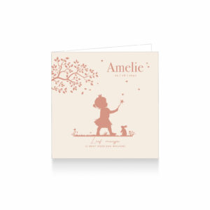 1320-Lief silhouet geboortekaartje voor een meisje. Op dit schattige kaartje zie je een meisje verkleed in tutu met een toverstokje in haar hand en kroontje op haar hoofd op een beige achtergrond met hartjes.