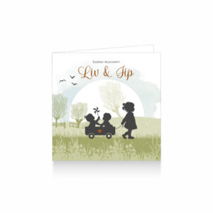 388-Lief silhouet geboortekaartje voor een tweeling, een meisje en jongen. Op dit kaartje zie je grote zus samen met haar kleine zusje en broertje in bolderkar wandelen in een Hollands landschap met knotwilgen