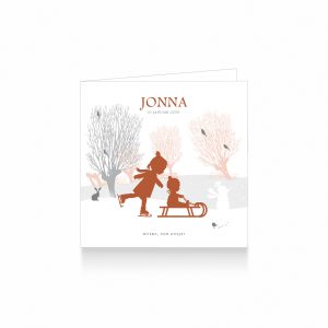 312-Winter silhouet geboortekaartje voor een tweede kindje, een meisje. Op dit leuke kaartje zie je grote zus op schaatsen haar kleine zusje op de slee duwen in een winterlandschap met knotwilgen