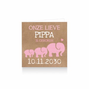301-hip geboortekaartje voor een meisje met typografie en olifantjes in roze tinten op kraft karton