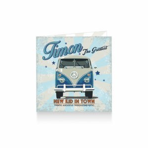 311-populair retro geboortekaartje voor een jongen van een vintage volkswagen busje met verweerde achtergrond