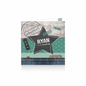 314-super stoer geboortekaartje voor een jongen van een krijtbord ster op spijkerstof, ruitje, stippen patroon en hout