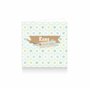 318-geboortekaartje voor een jongen met foto, kraftlabel, stempel op hout en sterren patroon