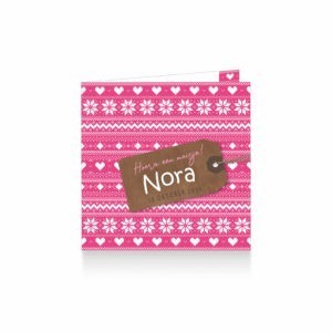316-hip geboortekaartje voor een meisje met kraft karton label op een achtergrond met scandinavisch patroon in hard roze
