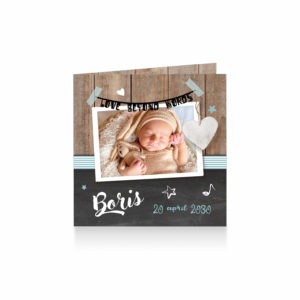 305-foto geboortekaartje voor een jongen met slinger en hartje van hout op krijtbord en hout