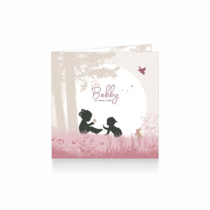 317-Lief silhouet geboortekaartje voor een tweede kindje, een meisje. Op dit kaartje zie je een baby meisje in een ledikantje met mobiel. Grote zus kijkt over het randje van het ledikantje naar haar lieve zusje in een bos met veldbloemen.
