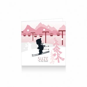 300-Wintersport silhouet geboortekaartje voor een meisje. Op dit leuke kaartje zie je een meisje skien in een winterlandschap met sneeuw, dennenbomen, een stoeltjeslift op de achtergrond met bergen in roze en rood tinten.