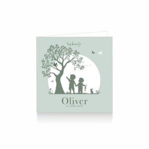 1692-Trendy silhouet geboortekaartje voor een tweede kindje, een jongen. Op dit leuke kaartje zie je grote broer hand in hand wandelen met zijn kleine broertje tussen bloemetjes, boom, konijntje, vogeltje en vlinders. Grote broer wijst naar een eekhoorntje in de boom.