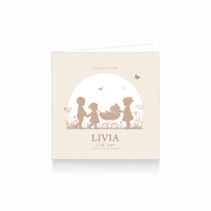 1702-Trendy silhouet geboortekaartje voor een vierde kindje, een meisje. Op dit leuke kaartje zie zusjes en broer met kinderwagen met daarin hun baby zusje in een landschap met veldbloemen en vlinders. Het kaartje is in mooie beige, zand tinten.