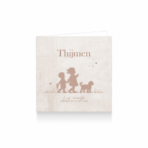 051-Super leuk silhouet geboortekaartje voor een tweede kindje, een jongen. Op dit kaartje zie je grote zus hand in hand wandelen met haar kleine broertje en hun hondje. Grote zus wijst naar vlinders. Dit leuke kaartje is in beige bruin tonen op een verweerde achtergrond.