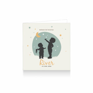 090-Trendy silhouet geboortekaartje voor een tweede kindje, een jongen. Op dit leuke kaartje zie je grote broer met een bellenblaas sterren blazen en klein broertje kijkt verwonderd toe.