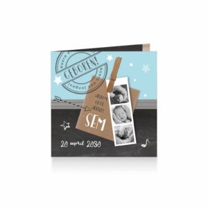 1275-Hip en trendy geboortekaartje voor een jongen met een kraftlabel met knijper en strook met drie foto inzetjes en een stempel op krijtbord en sterren op een lichtblauwe achtergrond