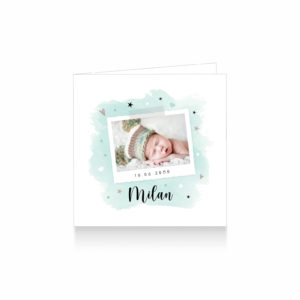 1276-lief en rustig geboortekaartje voor een jongen met foto, hartjes en sterretjes op blauw aquarel en witte achtergrond