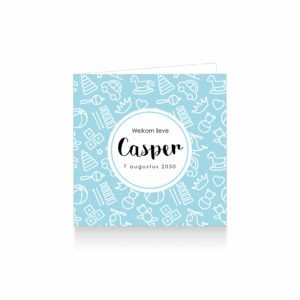 130-strak geboortekaartje voor een jongen van een rond wit labeltje op een achtergrond met speelgoed patroon