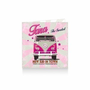272-populair retro geboortekaartje voor een meisje van een vintage volkswagen busje met verweerde achtergrond
