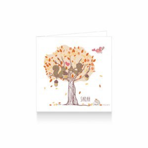 263-getekend geboortekaartje van boom in herfst tinten met eekhoorntjes, vogeltjes en egeltje