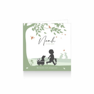 276-Super leuk silhouet geboortekaartje voor een jongen. Op dit kaartje zie je een jongetje met trekkar met daarin zijn puppy hondje en een voetbal, in een heuvelachtig landschap met konijntjes, vogels, vlinders en een boom op de achtergrond.